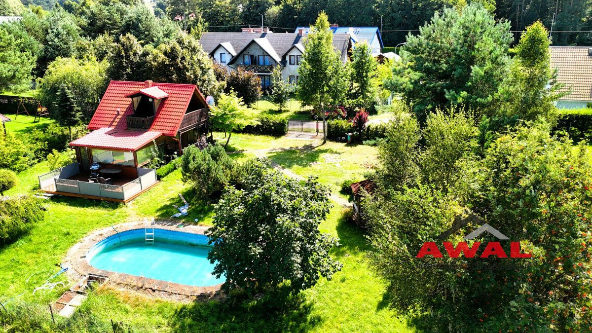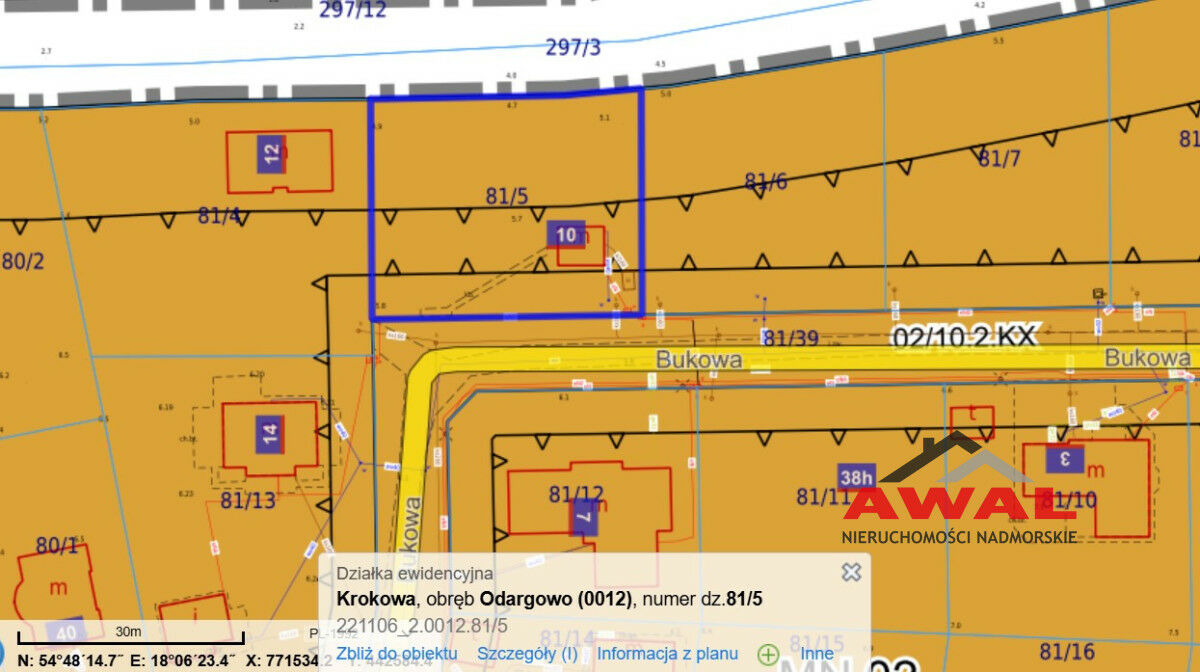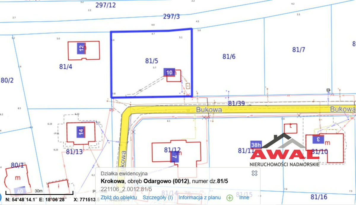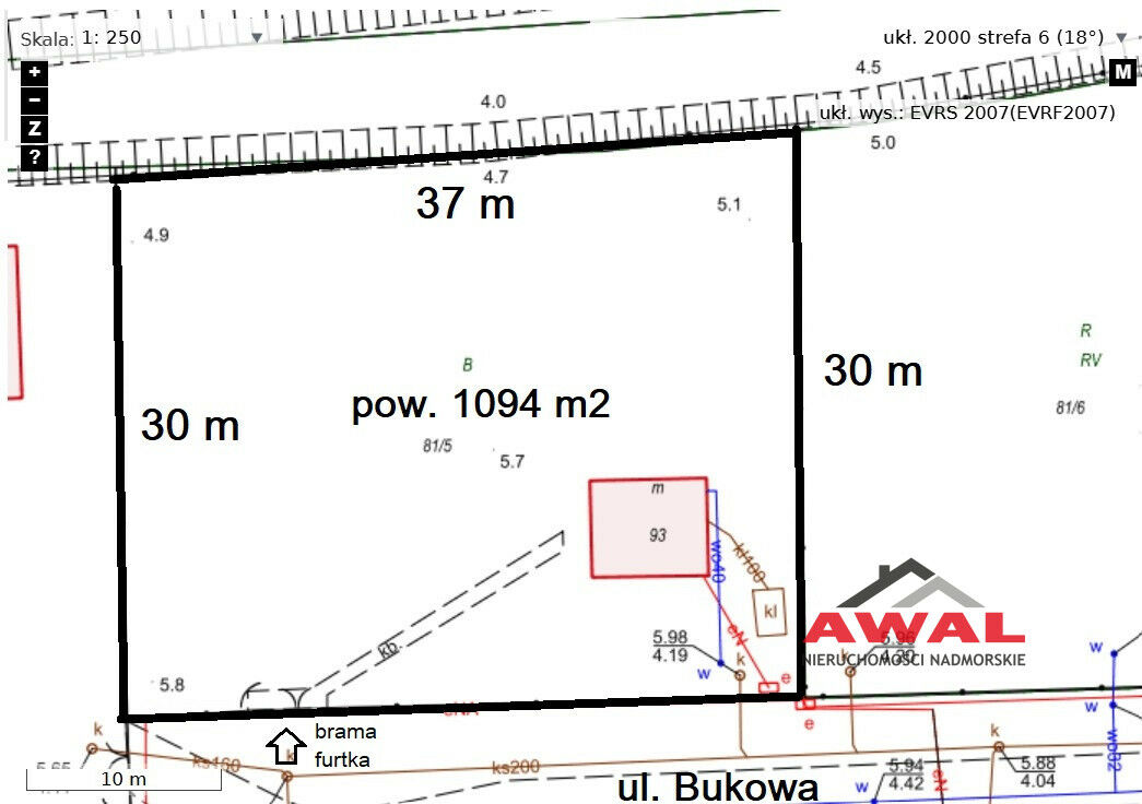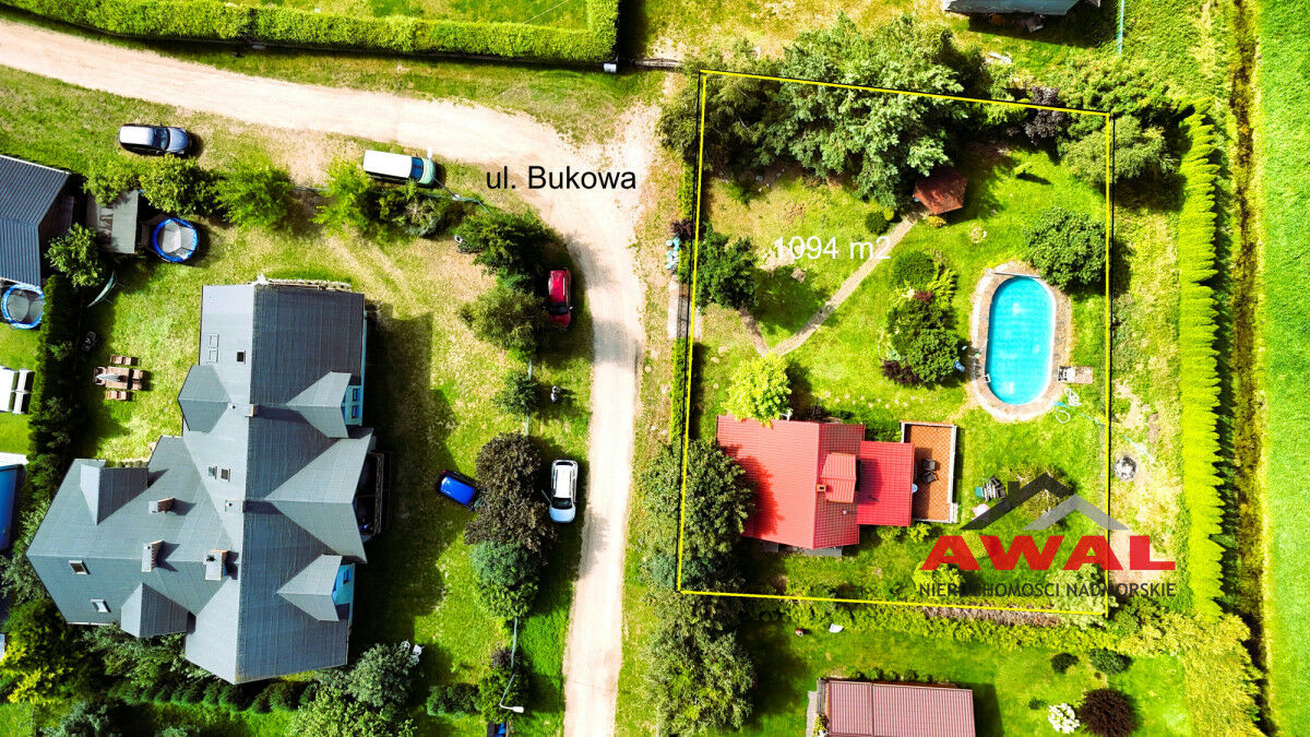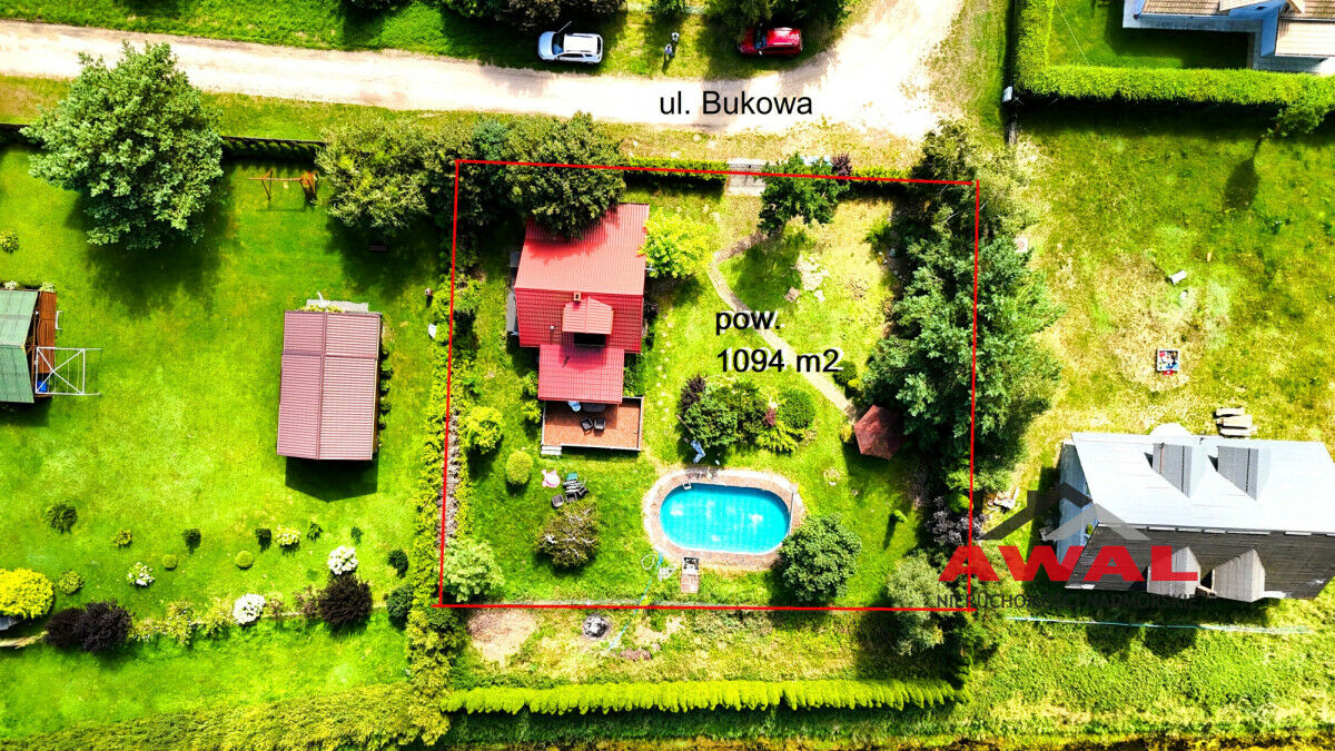 Działka budowlana o pow. 1094 m2 w kształcie zbliżonym do prostokąta o wymiarach: 37 m x 30 m. Całość ogrodzona, brama, furtka, kostka, nasadzenia krzewów i zieleni, basen zewnętrzny, altana. Media: woda, prąd, szambo. Gaz i kanalizacja w ulicy Bukowej tuż przy działce.